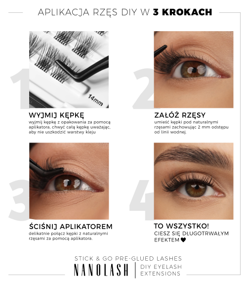 Kępki rzęs Nanolash Stick & Go Pre-Glued to innowacyjne rozwiązanie dla osób ceniących wygodę i szybkość aplikacji. Dzięki elastycznej i odpornej na odkształcenia strukturze zachowują swój idealny kształt przez cały czas noszenia. Włoski osadzone są na ultracienkich, elastycznych paskach pokrytych transparentną warstwą kleju, co umożliwia szybką aplikację bez potrzeby użycia dodatkowych produktów. Po przyklejeniu od spodu naturalnych rzęs łączenia pozostają niewidoczne, gwarantując efekt naturalnego zagęszczenia. W jednej kasetce znajduje się aplikator oraz 36 kępek w trzech długościach - 10, 12 i 14 mm - co wystarcza na 4-6 aplikacji, w zależności od wielkości oka. Efekt pięknego spojrzenia może utrzymać się nawet od 3 do 5 dni.